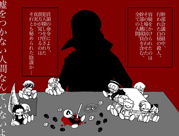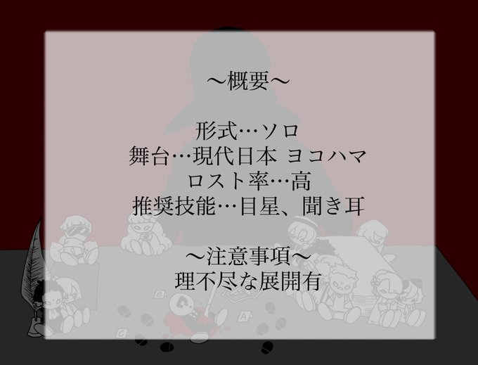 ④trpgっぽく描いてみたかった作品。大まかなストーリーだけは脳内にあるものの話の組み立て方が一切分からない。私がやりたい。 ロスト率高めの設定なのはPLが幹部達に話を聞いていく上で、質問内容の選択を間違えたり見落とした情報があるとNPCの逆鱗に触れ、消されるから。