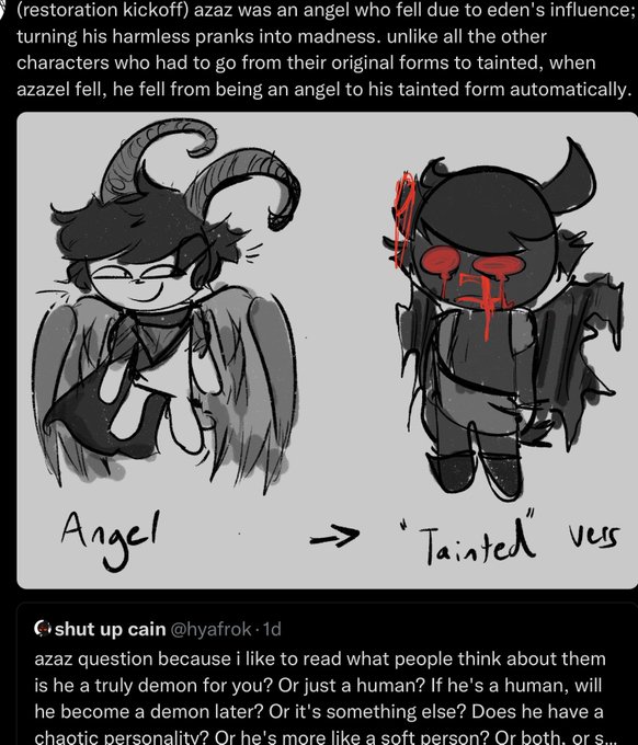 (restoration kickoff) azaz was an angel who fell due to eden's influence; turning his harmless pranks into madness. unlike all the other characters who had to go from their original forms to tainted, when azazel fell, he fell from being an angel to his tainted form automatically. https://t.co/HVcavI8Kb0