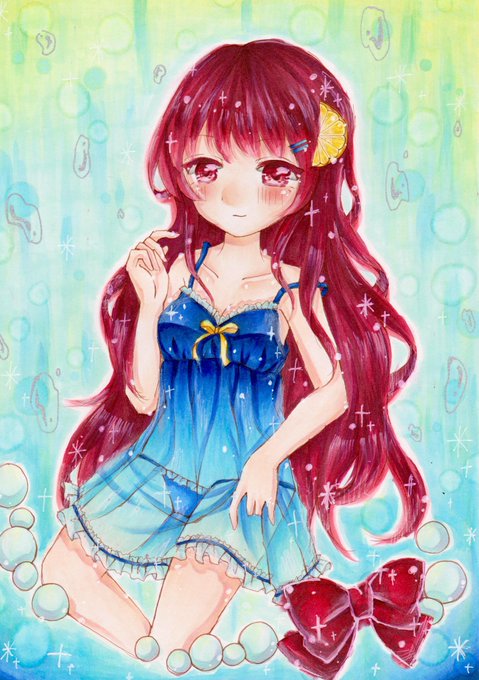 #カクテル擬人化お絵描きリレー 6日目最終日のチャイナブルーです💕 ライチ味のカクテルらしいので赤髪の女の子にしてみました(●´ω`●) 今回はこの企画に参加して下さったみなさんありがとうございました😂🙏💕素敵絵がたくさん見れてほんとによかったです😍😍😍