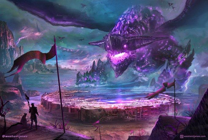 Kralkatorrik over Gandara. I had to rush this piece out before the patch on Tuesday! I hope we get to see the #GuildWars2 version of Gandara: The Moon Fortress (preferably in one piece). @GuildWars2