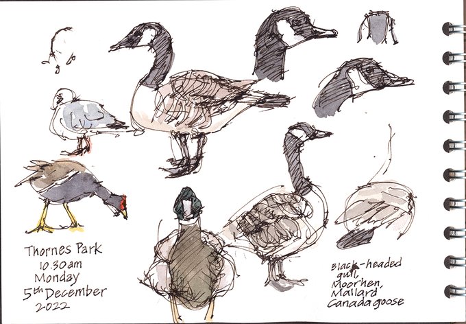Black-headed gull, moorhen, mallard and Canada goose at Thornes Park duck pond this morning.