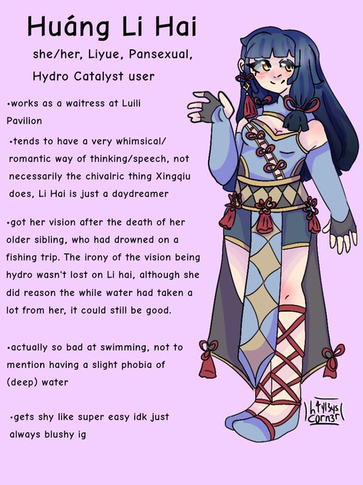 Update! Li Hai has an updated sheet AGAIN and she has her vision now ^^, now I don't know her weapon... Probably a polearm!
