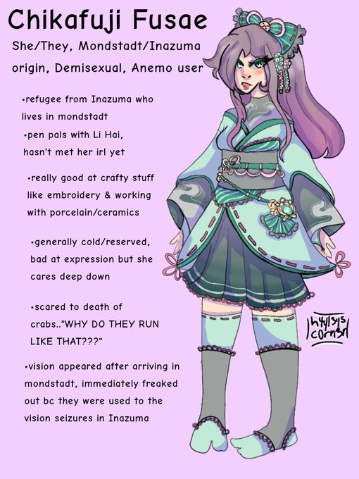 Did some redesigning on my genshin ocs: Li Hai stayed fairly similar but Fusae/Haruka (she got renamed) changed a bunch! The old reference sheets are included so you can compare :' )