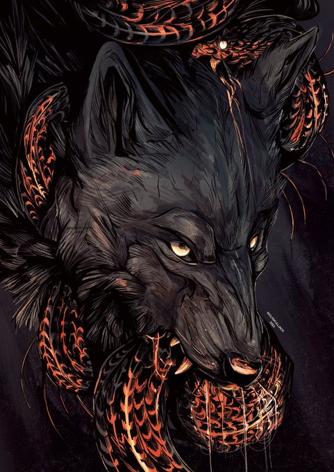 In 2021 I was hired by the mighty @Metallica and I dove headfirst into making a Of wolf and man piece for obvious reasons! This is an unused black, grey and red version! The one that went to print was gold and orange!