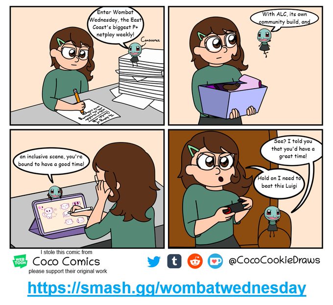 Hey, it's me, your conscience, reminding you to sign up for Wombat Wednesday! Thanks to Auto L-Cancel, our inclusive community, and our own dedicated build, we're the biggest P+ netplay weekly around! Don't miss out!