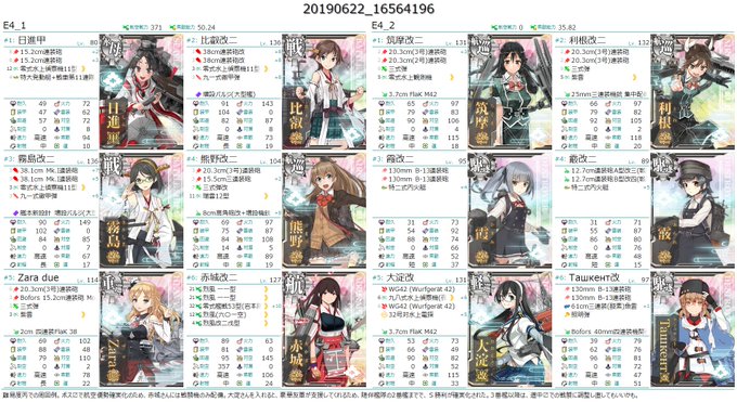 Fletcherたんとの邂逅に成功。邂逅時の編成と周回実績などの詳細を、添付画像の2枚目以降に示した。燃料の残量も2万を下回りそうになり、厳しい状況だったが、現有戦力の微調整による戦闘の最適化や、祈願絵の作製など、色々と有意義であった。現刻をもって、通常任務とE5での練度向上任務に移行する。