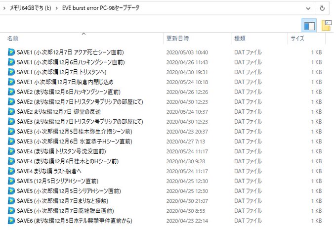 PC-98版 EVE burst errorをエミュレータで遊ぶと、6か所しかセーブできないので(表記もバグりやすい)、ゲーム本体.hdi をDiskExplorerなどで展開して、SAVE.DATを別に保存しておくと、あとでいつでも名シーンにアクセスできますよ #EVE_burst_error
