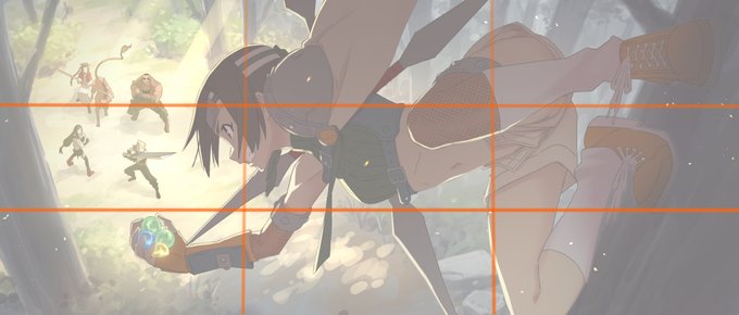 7の絵は練習のためシネスコサイズで行こうと決めて、とりあえず三分割法で顔とお尻が来るようにしましたw主役の目標物(クラウド達)が画面端に寄ってるのはいいのかわからずそのままいっちゃいました