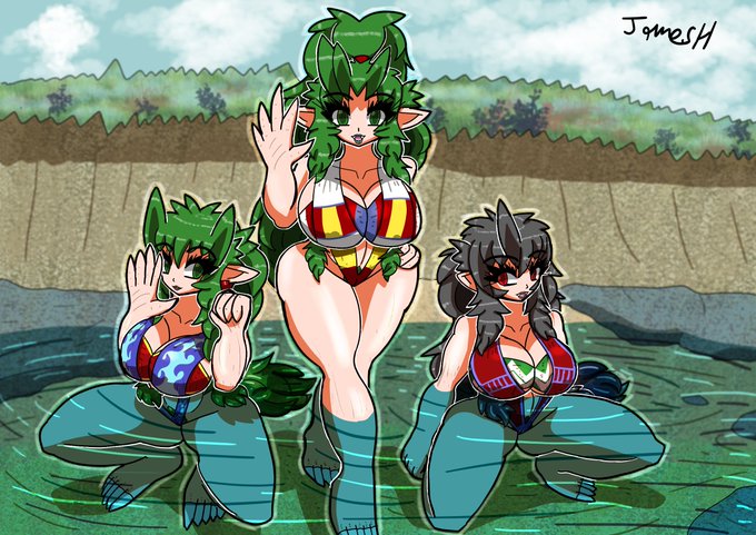 Tsekrei, Queen Yuufia and Volkara in a stream in Zarat. #originalcharacter #fantasy