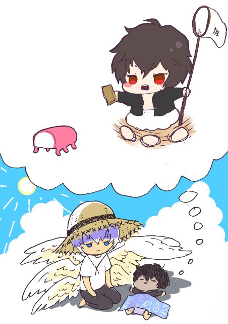 漁氏さん(@ man10asarisi)のこのツイートの、夏の海のかまもことちびだるふぉんちゃん。と、るしへるさま。