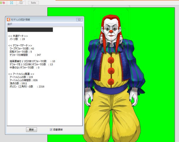 このモデルの統計情報ってはじめて見たからまだ内容よくわからんのだけど、いちばん下の数値が全体のポリゴン数よね?最も多いのは腕の切替とかが多いはちこで4304、次点がお墓を背負っている陽炎くんの3958だった。清水は意外に少なくて2316。変形の大部分をデフォーマで管理してるからかな? #Live2D