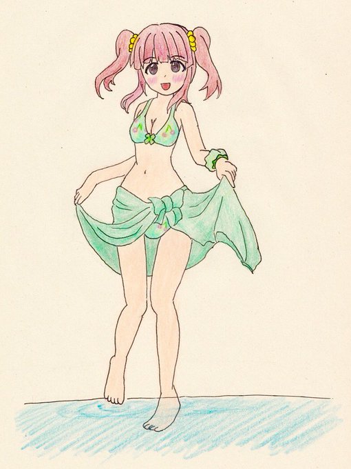 今日は智絵里じゃ〜♪ ①智絵里が水着で水面をぱしゃぱしゃ歩きながら微笑む ②カワイくて俺P即死 #暑いから担当の水着貼る #緒方智絵里