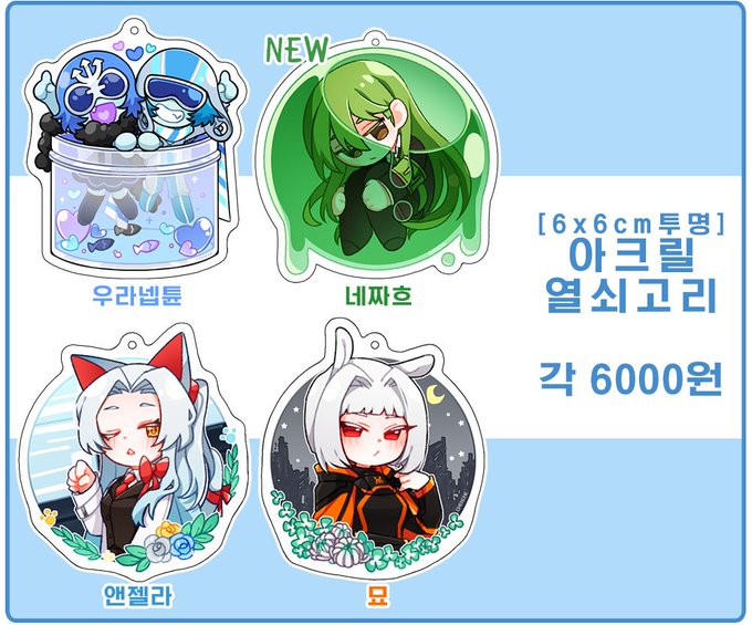 뉴굿즈는 [열쇠고리 1종],[창작 틴케이스 2종],[창작 스티커 1종]으로 이미지를 참고해주세요!