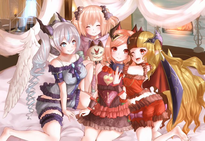 一夜限りのお泊まり会【フォロワー400人記念絵】 リリ達が千夜会後、1日だけお泊まりする世界線。ユニットのイメージを元にそれぞれパジャマスタイルに。 リリがみんなと一つのベッドで寝ようと提案してる構図(適当) 背景は参考物ありです😇 #クリプトラクト #クリプトお絵かき