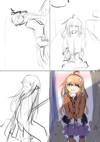 先日の宣伝絵に載っけてたカー子線画とイメラフ(2枚目右下) 後で塗ります。が、マンガ原稿とフォロワー200人記念ミゼル絵で飽和中