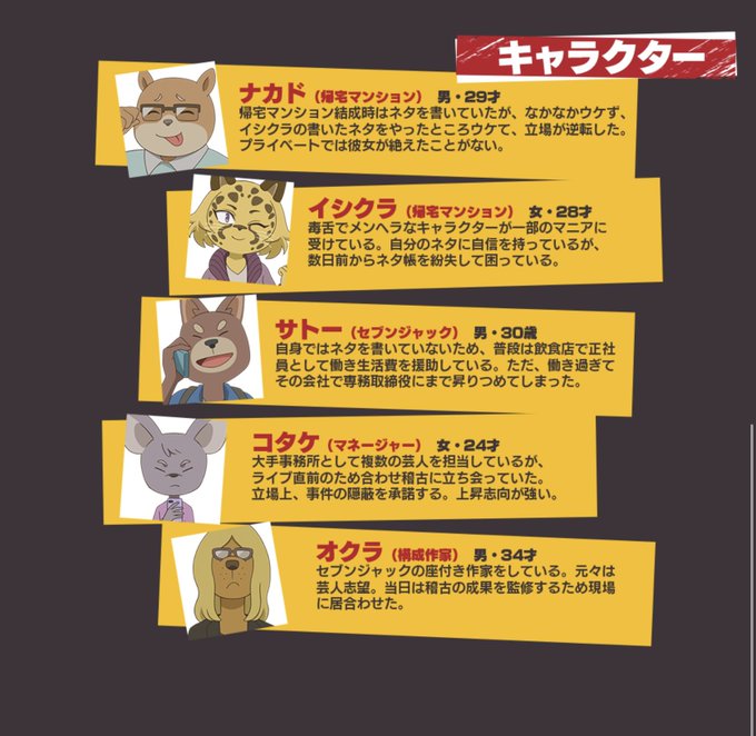 今週末、都内にてオッドタクシーのマーダーミステリーで遊ぼうと思ってるんですが、興味のある人、遊んでみたい人はいますか? マーダーミステリーとは殺人事件の登場人物の一人になり、事件を解決に導く(もしくは犯人だとバレないようにする)アナログゲームです。 初心者歓迎。