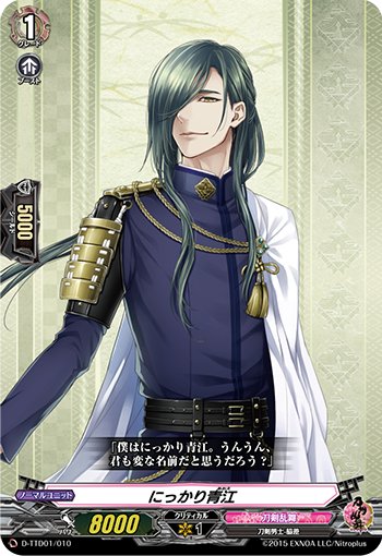 【VGD刀剣乱舞】「にっかり青江」もスキルを持たないカードです。コスト消費もなく味方のスキル使用との兼ね合いなども気にしない、石の灯籠ごと斬ったという純然たる切れ味だけに集中することができます。後方支援に向いているので彼の前方には強力な刀を配置するといいでしょう。 #YCFgカード紹介
