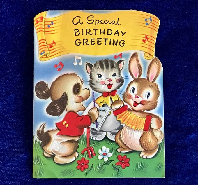 A 1940’s birthday card with an adorable puppy, kitten and bunny illustration. French fold design. For sale at https://t.co/92BjKTFNLm. #VintageBirthday #GraphicDesign #VintageGreetingCards #greetingcards #ephemera #1940svintage #puppy #kitten #CockerSpaniel