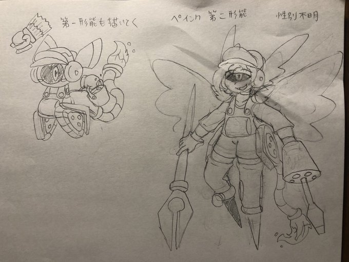 ペインク第2形態のラフとそれを元にした軽いイラスト 僕の創作キャラには、体の形の変わるキャラがいくつかいるよ