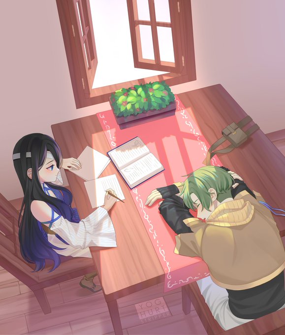 These are my OCs, Emerys, the one studying, and Kaize, the one taking a nap. Kaize is usually busy but he spends every free time with Emerys, though he dozes off sometimes. Emerys doesn't mind as she is just happy her brother is getting some rest.