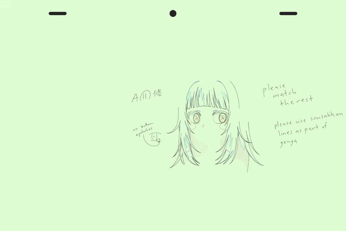Gawr Gura "Shark'd" Chief AD (総作監) corrections from Section 5 in green, overlaid with 2nd Key AD (原画作監) corrections in yellow (lighter).