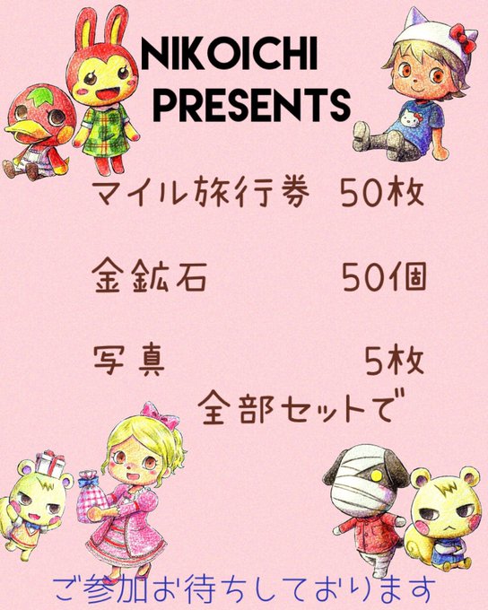 ヒロ🎀主催企画リレー 【Cグループ】 18:00〜19:00 担当にこいち 💫60分企画 💫マイル旅行券50枚 金鉱石50個 写真ランダム5枚 💫参加方法➨ ゆ~(@Yu18870814 )と あきてぃ(@kittylushlove1 )のFollowとRT 💫当選人数➨1名様 💫抽選➨あたれら #あつ森企画リレー