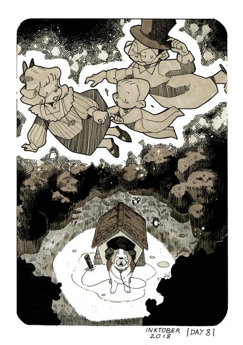 |DAY 8| After a short flying lesson all the kids get ready to go to Neverland. Nana can't believe her eyes when she sees them flying out of the window. That night Nana is grounded and tied up, but she still fights to follow them without any success. #inktober #inktober2018