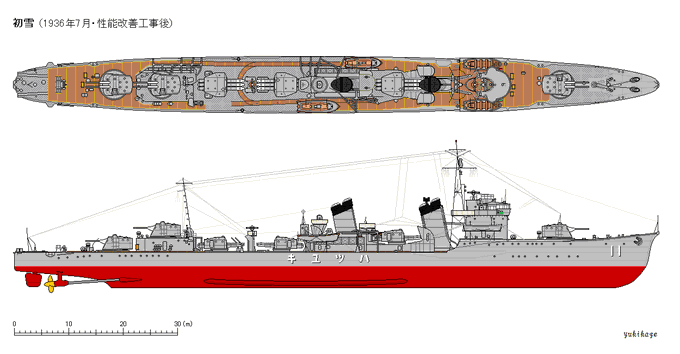 |ヮ')<TLで見かけた艦船を~ ( -.-)ノ͡͡゜ 写真そのものの時期のは描いてなかった… ので手持ち全て貼ったら新造時~最終時の変遷になった (というかそのつもりで描いたやつだった) #駆逐艦 #吹雪型 #初雪