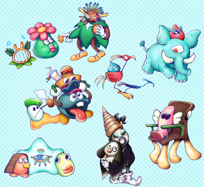 Asked my friends to pick which #MoonRPG monsters are cutest and funniest then drew them together 🌸🐘🪑🍔🌟✨