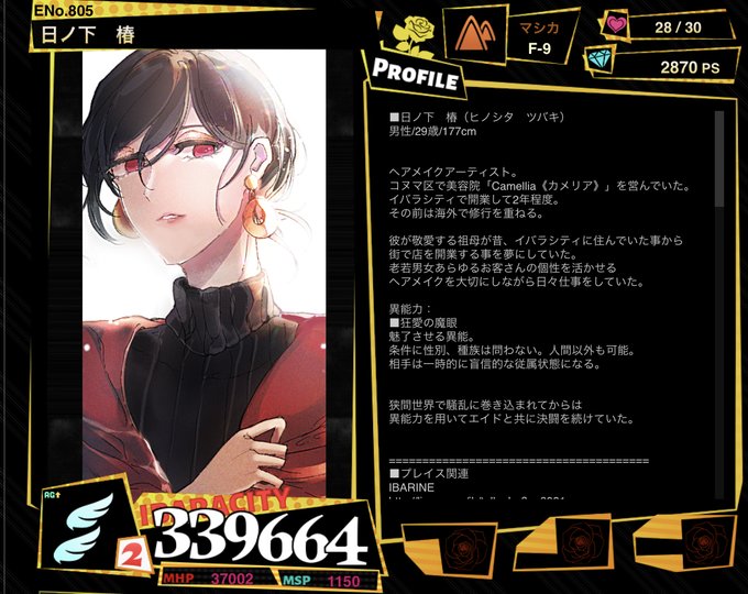 @ibr_wall タイミングを失っていたのでここで… 茨街ENo.805 日ノ下 椿でした。交流でお付き合い頂いた方、ひっそり追って下さった方、ありがとうございました。またね🌺