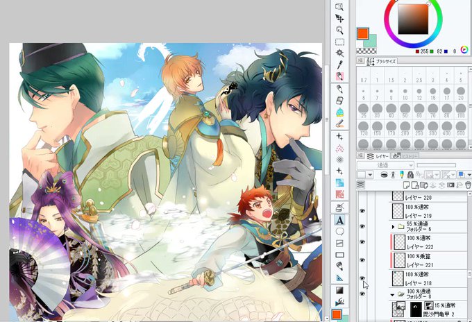 最近描いた絵で集合絵以降レイヤー分けしてきちんと塗ったものがそもそもパレード絵しかないんだけど誰か一番レイヤー数多いかってやつ