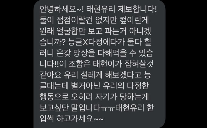 헉...또 갓컾이 제보왔습니다...!!! 세상에ㅠㅠ 오마이갓오마이갓 능글이랑 다정이라니...봇주도 오늘부터 태현유리 팔 거 같습니다ㅠ 흑흑 너무나도 맛있네요ㅠㅠ 태현유리 이즈 쏘 딜리셔스!! 태현유리 흥해라!!