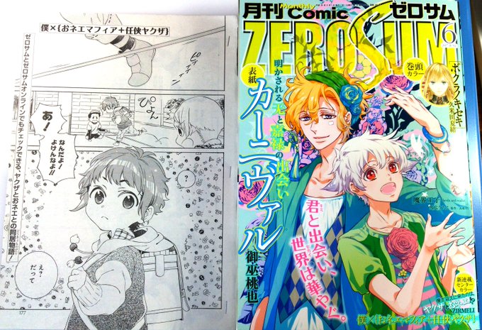 先月の4/28日発売のゼロサム6月号から始まった新連載始まりました。「僕×(オネエマフィア+任侠ヤクザ)」略して「マフィヤク」ってスタッフさんといってます。小学生とマフィアとヤクザのほのぼの日常マンガ。ヤクザさんの日常メインに描いてます。今回は遭遇回ですー! 麻晴