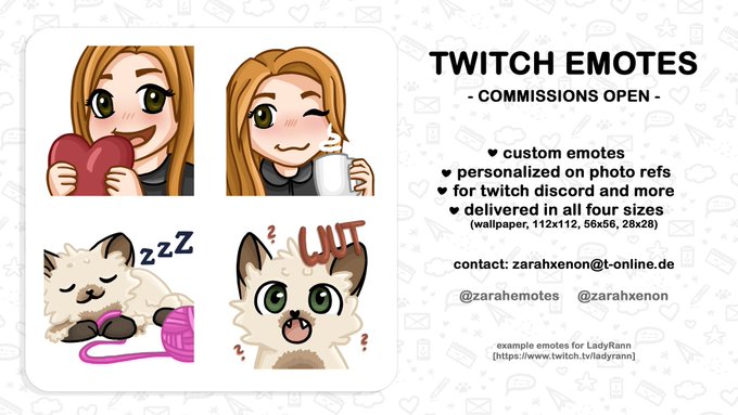 @Venitroll Hi, ich bin Illustratorin und erstelle Twitch Emotes / Sub Badges / Overlays / Panels / Illustrationen und mehr. Schreib mir bei Interesse einfach eine DM für Details. https://t.co/vV2cNn6Qh0