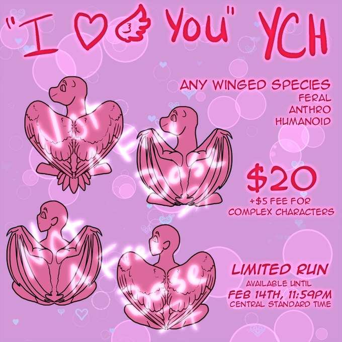 In time for #valentines, I'm bringing a cute $20 #YCH for winged OCs! This only runs until Feb 14th! Any winged species: #MLP, #furry, #humanoid; all eligible!