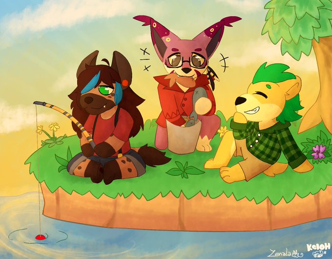 Did a collab with my friend Keioh (https://t.co/x44CD2q2yA) of her fursona, our friend's fursona, and mine in Animal Crossing style (or kind of)!
