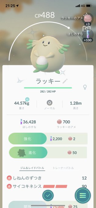 はい、キラッと来たぁあ!Σ(゚д゚lll)💦顔色が悪い色違いラッキーゲットやん!……2匹目ですが嬉しいかな?(*´ω`*)1匹はハピナスに進化させようかな?それとも交換用かな?(*´ω`*)