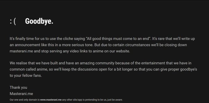 i knew someday this would happen one day... Goodbye Masterani, you guys offered the best quality also without ads. I had great memory's with the community #anime