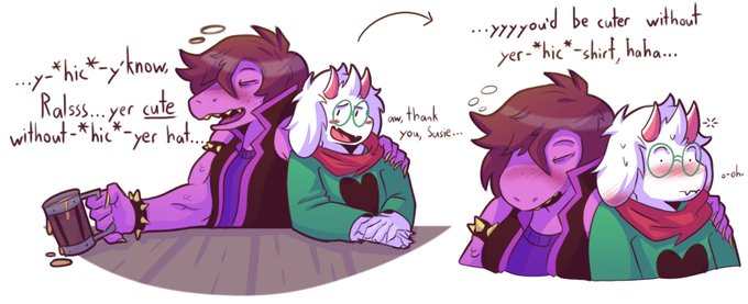 (SFW) A comp of intoxicated sketches, because god knows Susie isn't one to pass up "magic potions," more so around friends. There are a couple darkener traditions she enjoys, after all. #DELTARUNE #deltarunefanart
