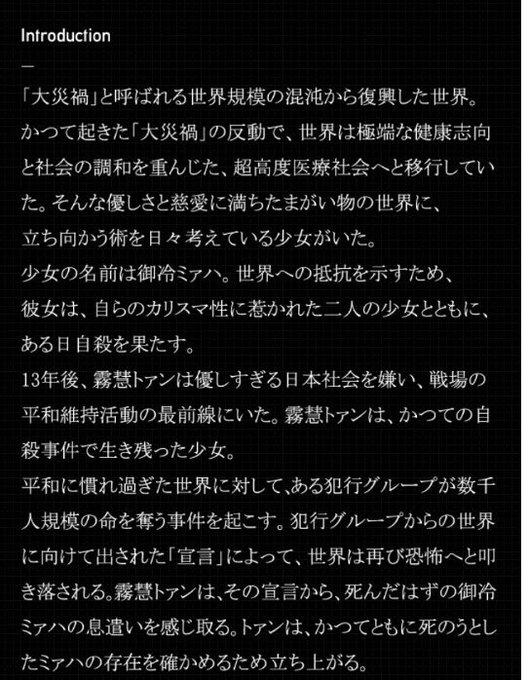 伊藤計劃のハーモニーも少し似たような感じかも。優しさと慈愛に満ち幸福でしめころされそうなまがい物の世界に強く抗ったカリスマ性をもつヒロインと二人の少女たちの物語。