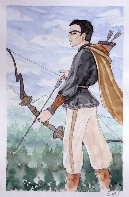 A5 à l'aquarelle. Il s'agissait de représenter le destinataire du cadeau en archer médiéval, avec l'arc dont il se sert en GN.