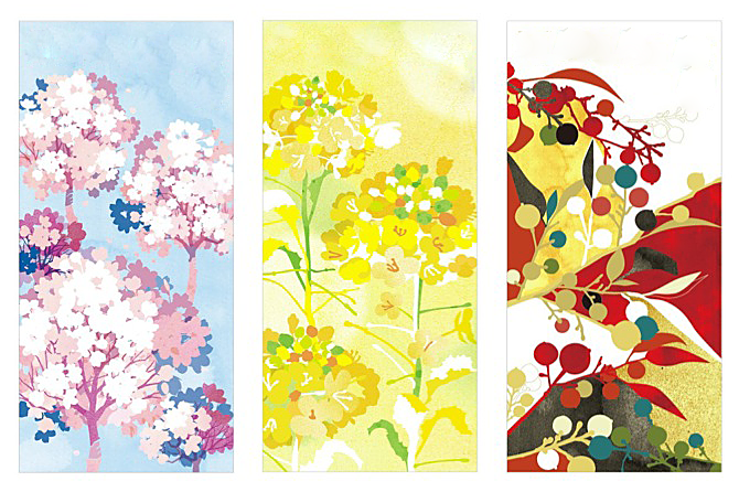 月ごとのイメージイラストのシリーズ。左から4月・3月・1月。