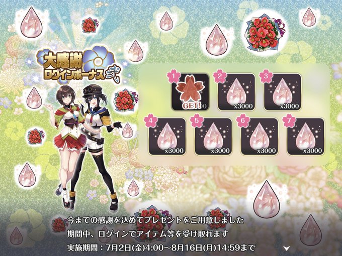 てんこ盛りのログボわろた。4日で一振りが極開花コンプできちゃうじゃん。 #天華百剣