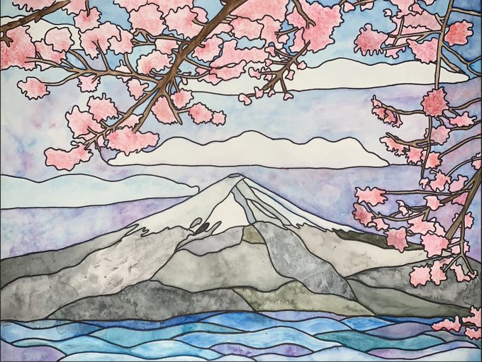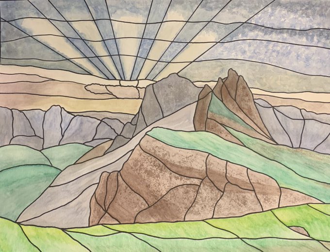 Pleased to share our Gr.10 Visual Art CPTs: Watercolour Stained-Glass Landscapes : Part 6 🎨🙏🙌 Students interpreted+abstracted a photograph into "glass pieces" with black ink, + translated textures, values + colours using various watercolour techniques @OLQWCA @OLQWCAarts