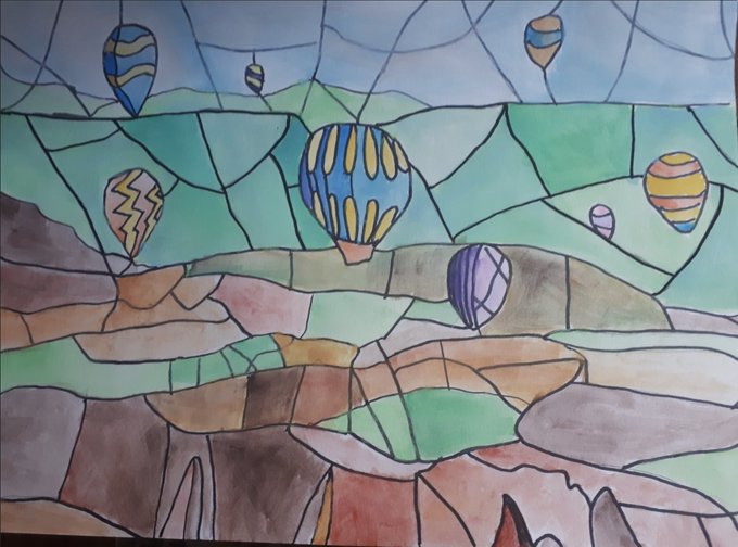 Pleased to share our Gr.10 Visual Art CPTs: Watercolour Stained-Glass Landscapes : Part 2 🎨🙏🙌 Students interpreted+abstracted a photograph into "glass pieces" with black ink, + translated textures, values + colours using various watercolour techniques @OLQWCA @OLQWCAarts