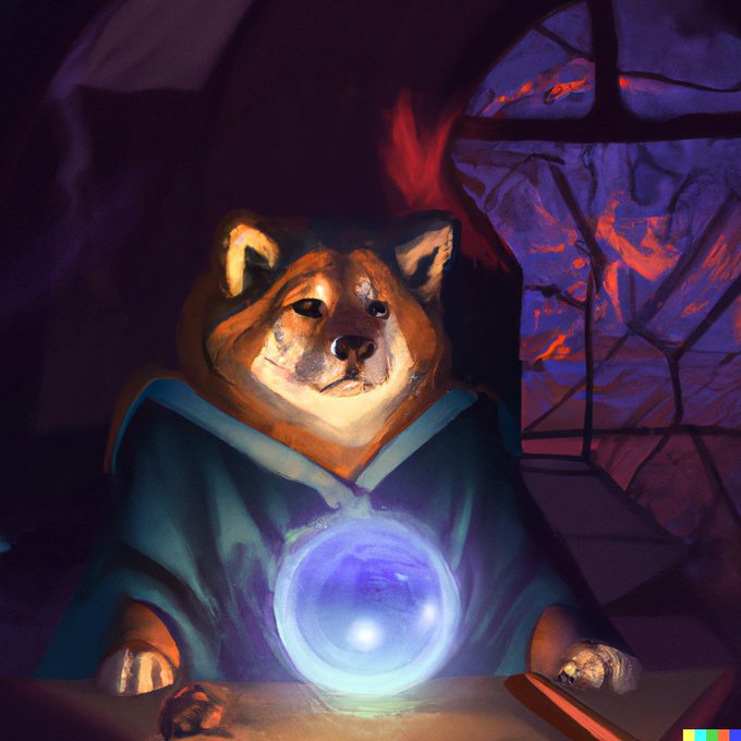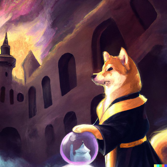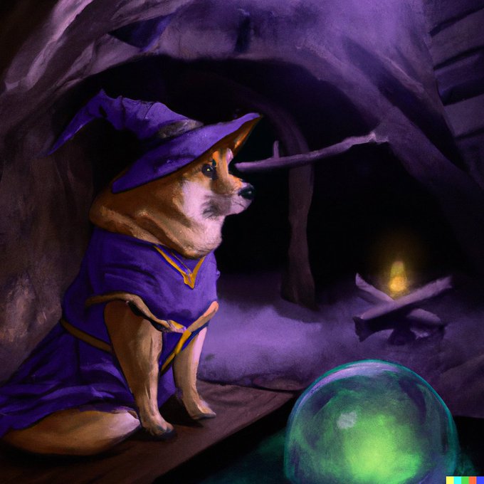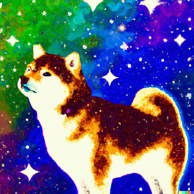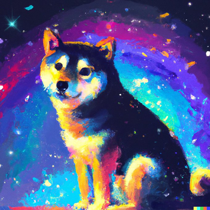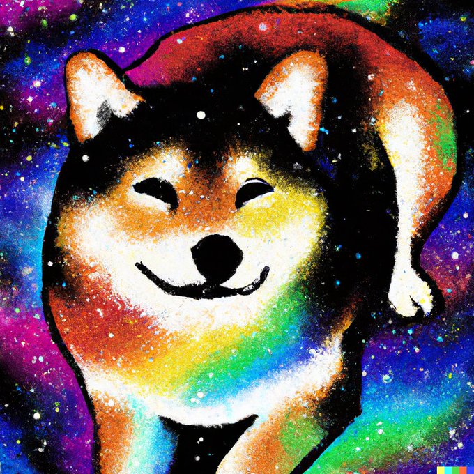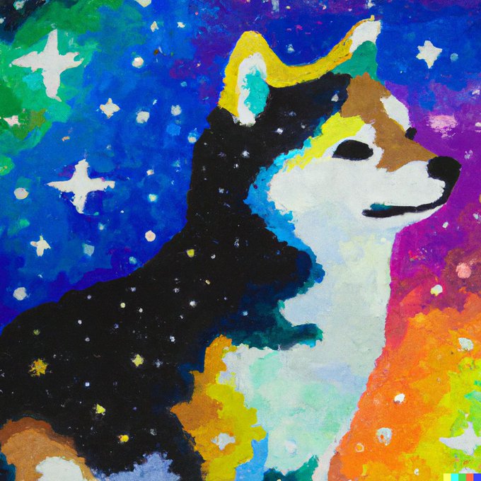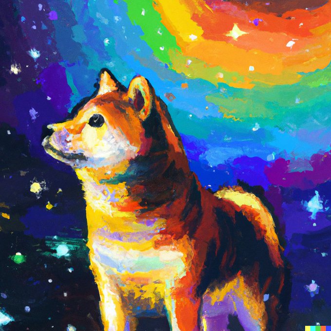 DALL·E 2, various results for “a painting of a shiba in the style of Starry Night, rainbow” (or similar prompt) 1)
