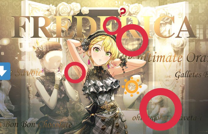 フェスデリカの背景の今までのお衣装、⭕️が恒常で左手靴が温泉限定で☀️のネックレスがクレクレぐらしか見つけられなかったんだけどまだあるのかな…?上の⭕️?は見覚えある気がするけど何かわかんない…