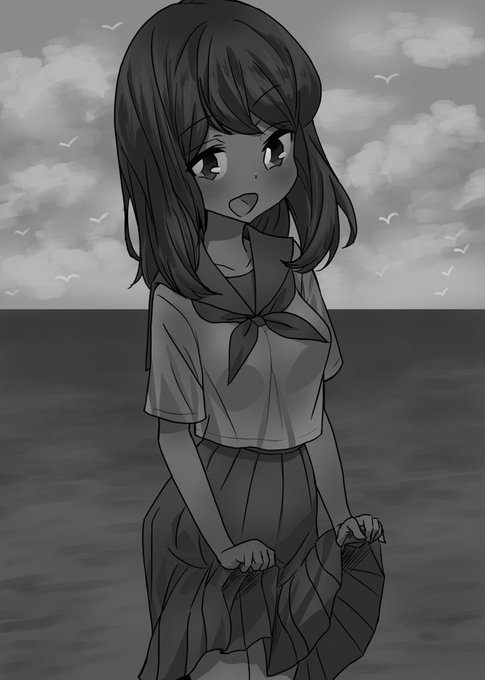 グリザイユで描いたうちの子と海(゚-゚ミэ)Э コロナが収まったら海に行きたいですね!