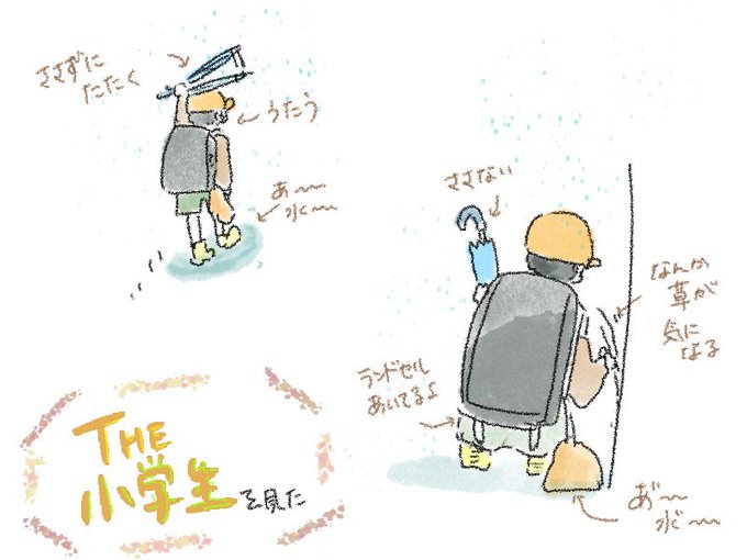 今日お見かけした少年が、この世の小学生男子を凝縮したような子でした。 (帰ったら、頭拭いて手洗いなね…) (おうちの方…彼の給食袋は…好奇心の犠牲となりました…) #イラスト #イラスト日記 #絵日記