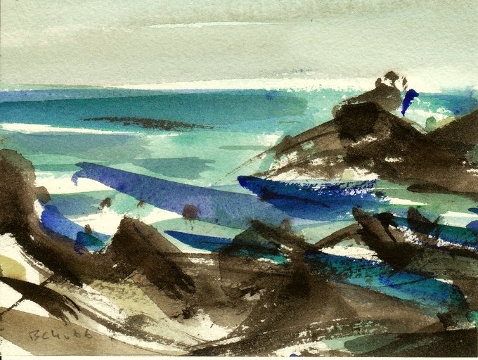 "Rocky Coast" - watercolour on a postcard My donation to Twitter Art Exhibit 2021 now ready and soon off to the PO📮All in support of a good cause. @L_I_N_C @twitrartexhibit #Watercolor #TwitterArtExhibit #TAE21 #Charity